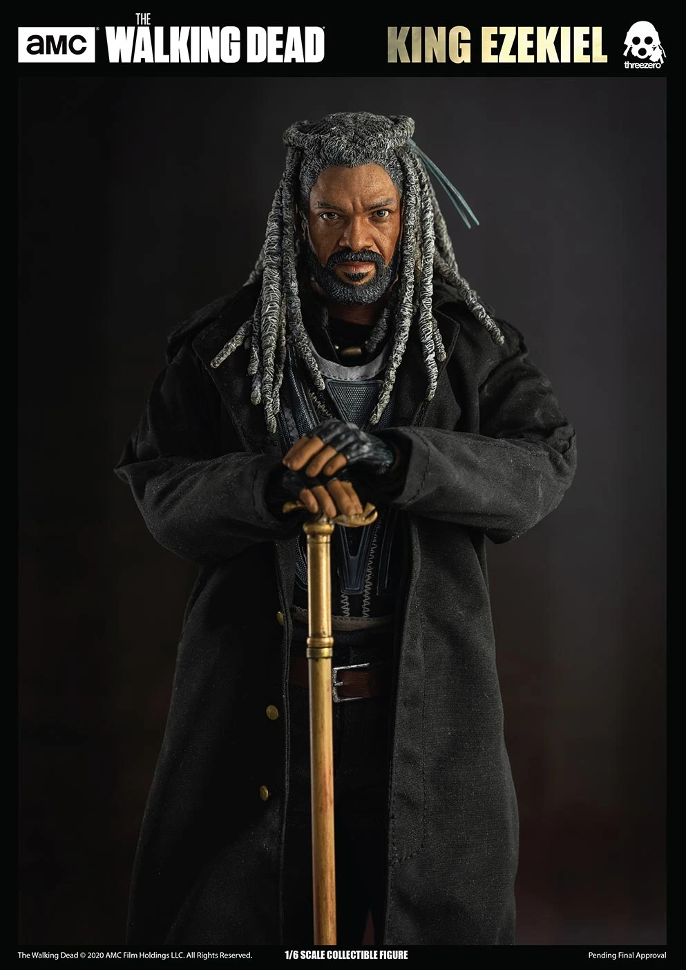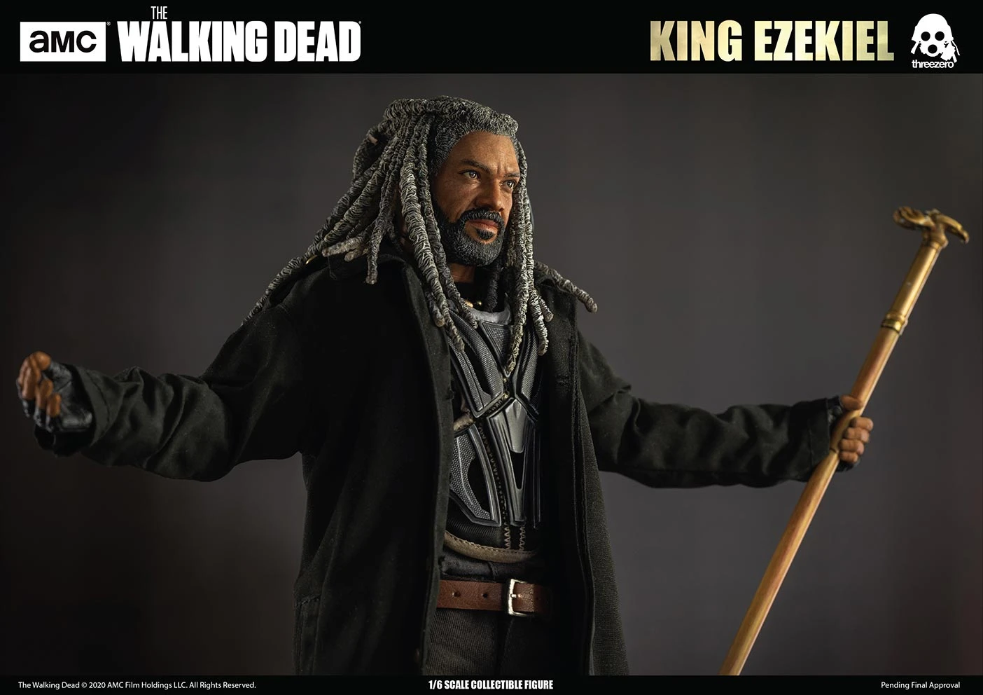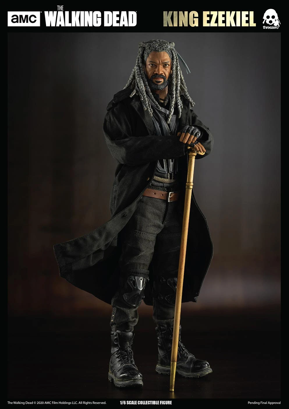 The King Ezekiel collectible figure stands approximately 12” (~30 cm) tall with a fully-articulated body, multi-media materials, signature weathering paint application, and highly-detailed sculpt featuring realistic likeness of King Ezekiel as portrayed by extremely talented Khary Payton in the critically acclaimed The Walking Dead television series.