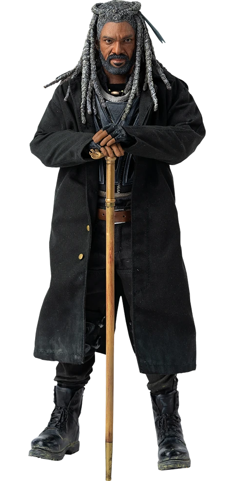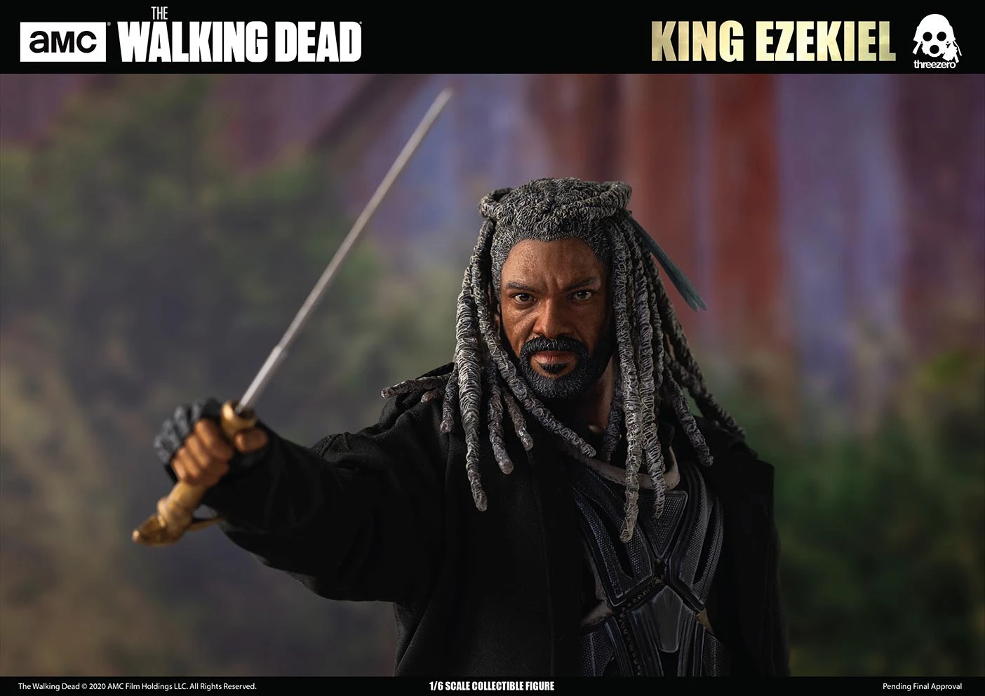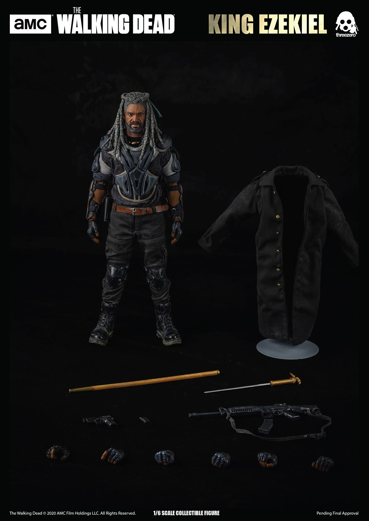 The King Ezekiel collectible figure stands approximately 12” (~30 cm) tall with a fully-articulated body, multi-media materials, signature weathering paint application, and highly-detailed sculpt featuring realistic likeness of King Ezekiel as portrayed by extremely talented Khary Payton in the critically acclaimed The Walking Dead television series.