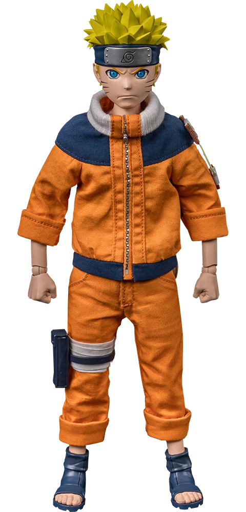 The Naruto Uzumaki Sixth Scale Collectible Figure stands at approximately 9.5” (25cm) tall with 29 points of articulation and features three interchangeable expression face plates (one serious face, one smiling face, and one surprised face). The fabric costume includes an orange training suit and a pair of Ninja shoes with magnets. Accessories include one necklace, one frog wallet, one beige waist bag, two Kunai knives, one knife bag, four Shuriken, and five pairs of interchangeable hands.