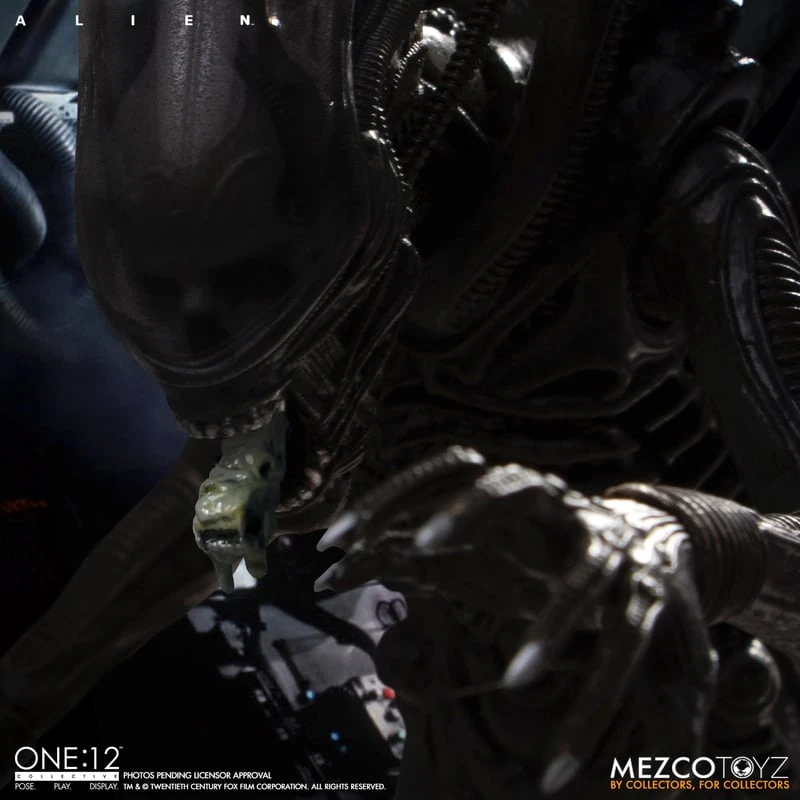 The One:12 Collective Alien features an all-new seamless body designed with an internal skeleton armature that is durable yet highly poseable. The hostile xenomorph is equipped with a hinged pharyngeal jaw and interchangeable inner mouths, as well as an interchangeable chest plate pierced by the ASSO-400 Harpoon Grappling Gun, as seen in the final scene of the movie.