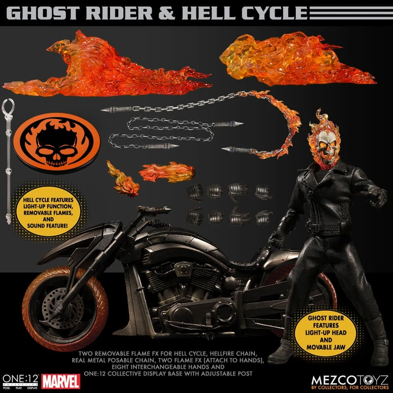 The Ghost Rider joins the One:12 Collective along with his Hell Cycle – featuring a light-up function, removable flames, and sound feature!Â