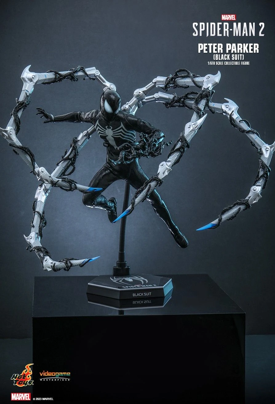 This amazingly-detailed figure features a newly crafted masked head sculpt, his physique depicted by a specialized body, newly developed black suit with detailed texture and patterns, articulated pincers with black tendrils, an array of accessories including black web shooter with newly designed black webbing accessories, web-wings, a tentacle effect, matching interchangeable hands and a display base.