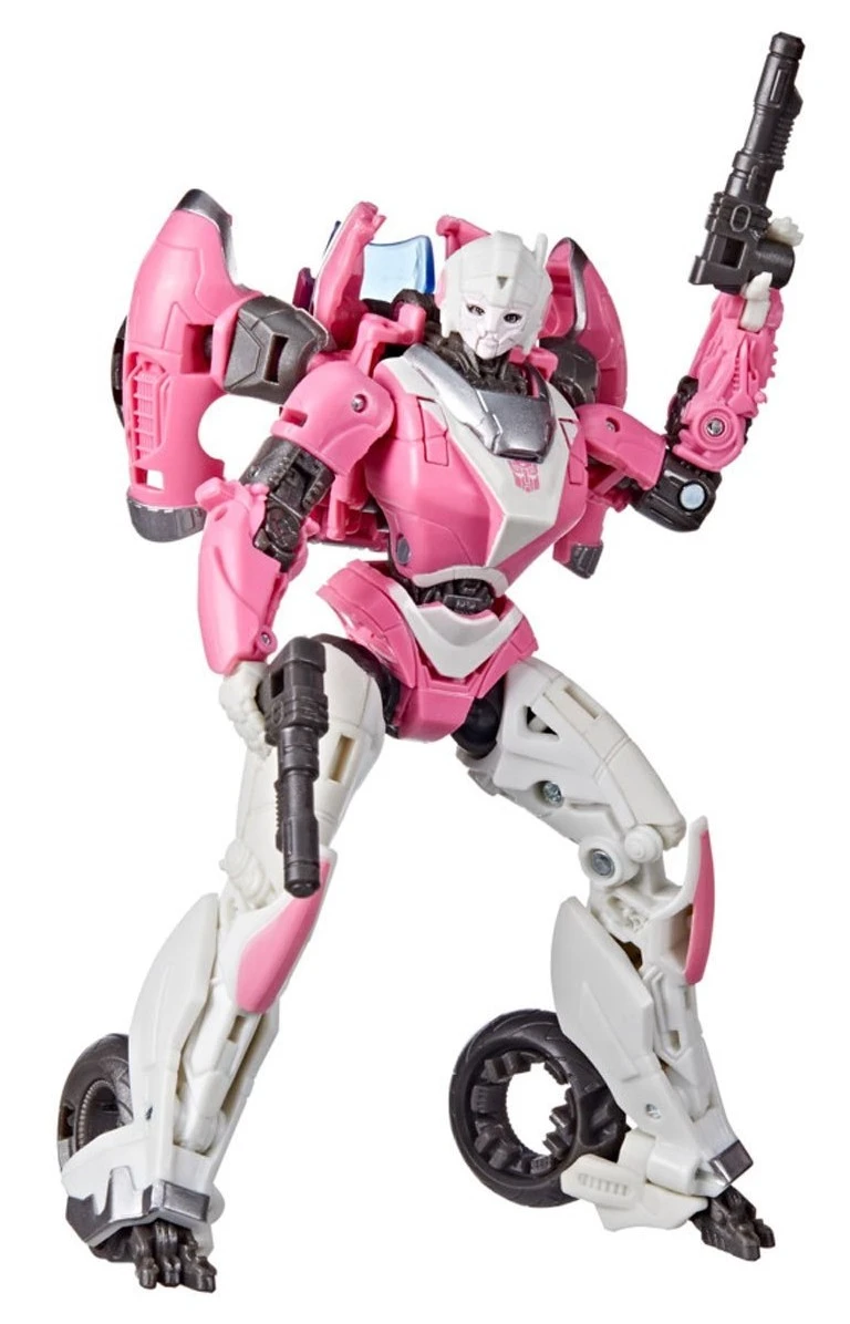 This Studio Series 85 Deluxe Class Transformers: Bumblebee-inspired Arcee figure converts from robot to Cybertronian motorcycle mode in 23 steps. Comes with 2 blaster accessories that attach in both modes. Remove backdrop to showcase Arcee toy in the Cybertron Falls scene. In the Cybertron Falls scene from Transformers: Bumblebee, Arcee loses contact with the capitol as the Autobots are overwhelmed by Decepticon forces. Pose the figure out with the included blaster accessories and imagine re-creating this classic movie moment!
