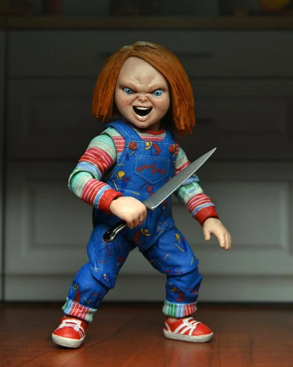 This Ultimate action figure depicts the murderous doll, inhabited by the soul of a serial killer, as seen in the all-new “coming of rage” TV series, CHUCKY. Including four interchangeable head sculpts, interchangeable hands, butcher knife, syringe bundle, and an interchangeable burnt arm. This figure stands 4″ tall with over 15 points of articulation.