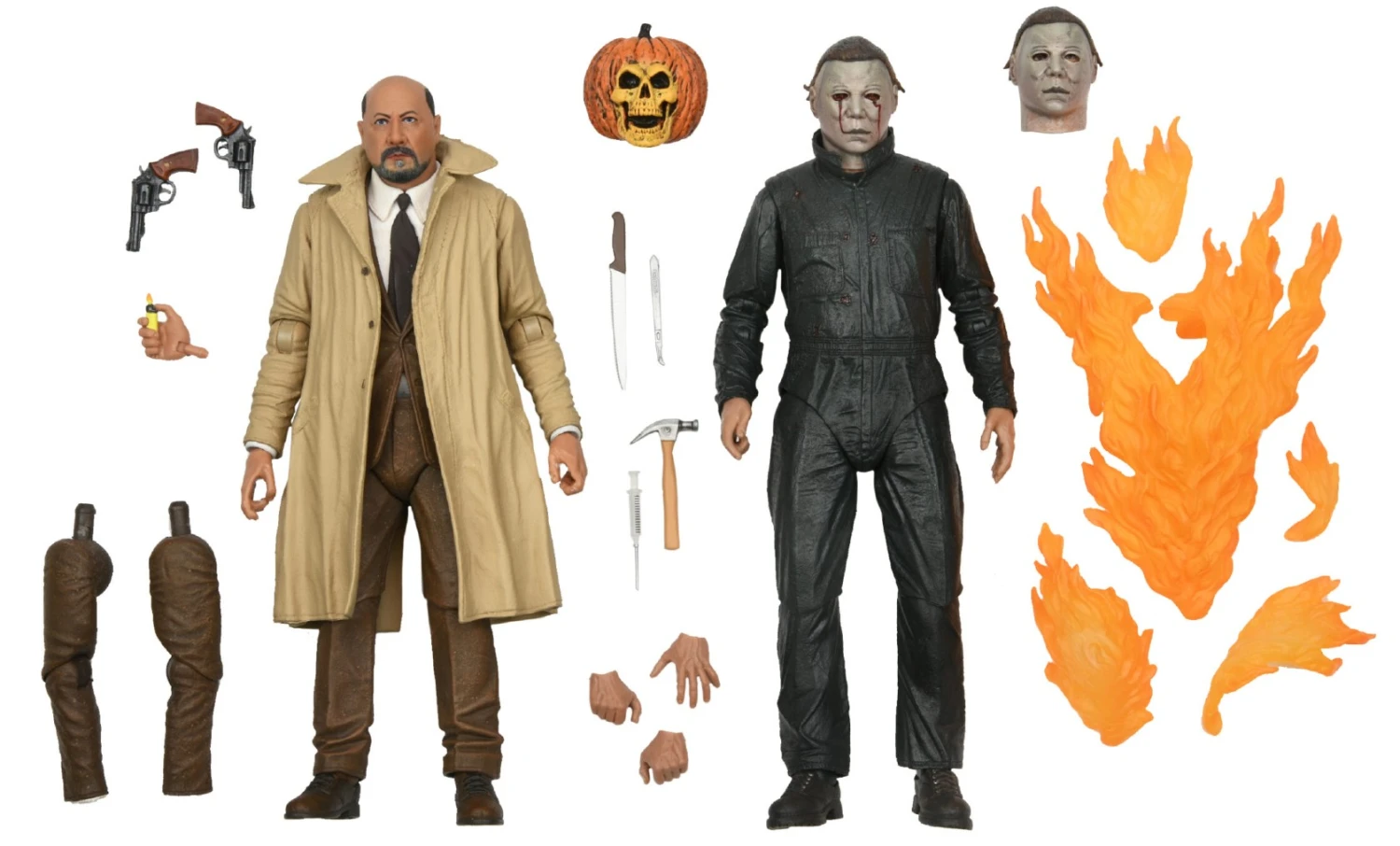 Both feature digital facial printing for extra accuracy. Dr. Loomis has removable arms so he can be displayed with or without his trench coat. Recreate the fire scene with attachable fire effects for Michael! It’s packed with more accessories too, including interchangeable hands, lighter hand for Dr. Loomis, 2 handguns, pumpkin, extra arms for Dr. Loomis, hammer, syringe, knife, scalpel, fire effect, and an extra “bloody tears” head for Myers.